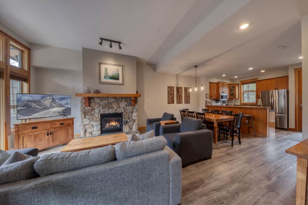 The main floor is bright and open, with a modern kitchen that opens to the dining room and living area with cozy gas fireplace and large screen internet connected (Netflix, etc.) television.